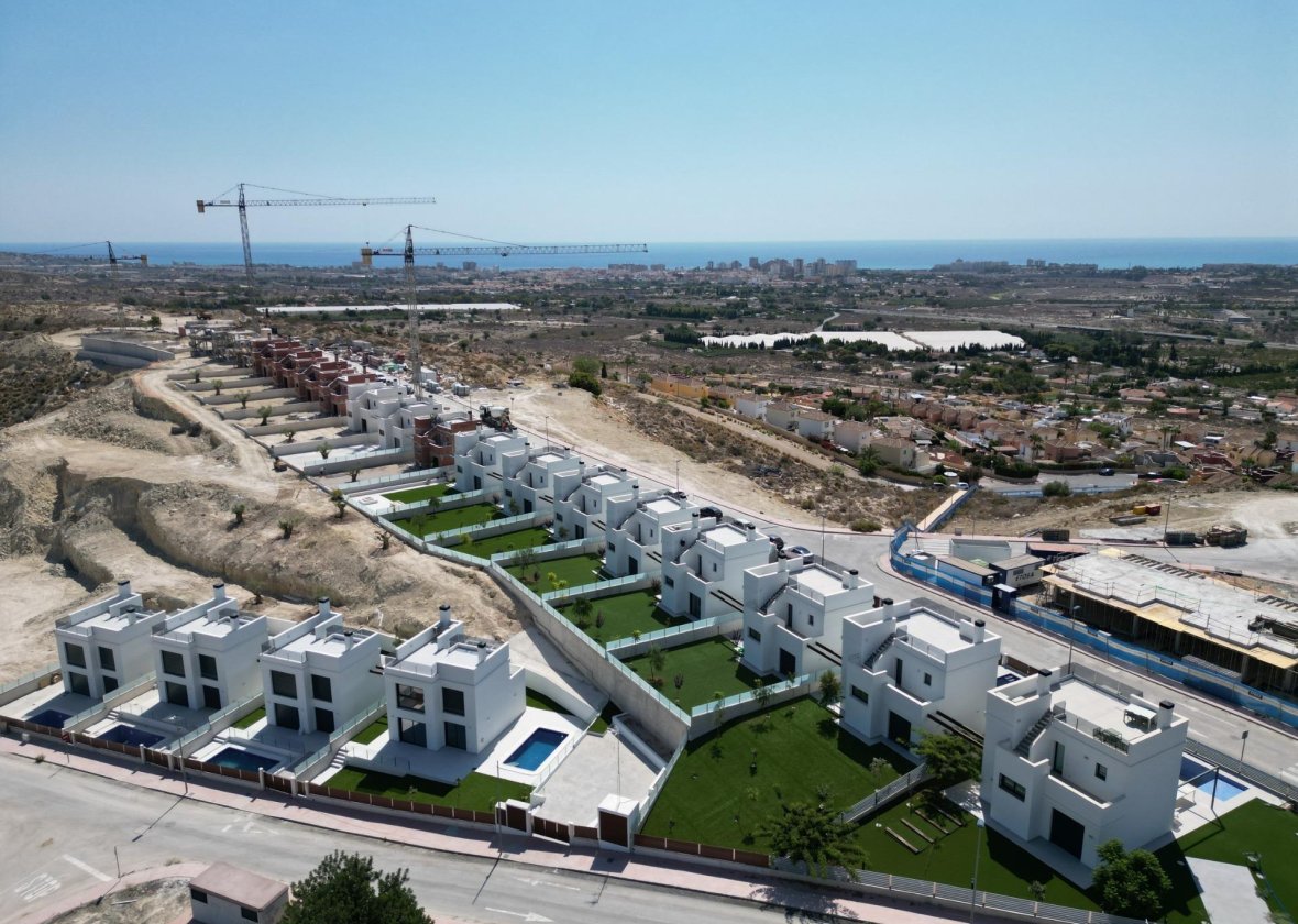 Die Häuser haben 2 Etagen und Sie haben auch Zugang zum Solarium mit herrlichem Blick auf das Meer. Auf großen Grundstücken von ca. 550 m2. Die erhöhte Lage bietet einen herrlichen Blick auf die Berge, die Stadt Alicante und das Meer.